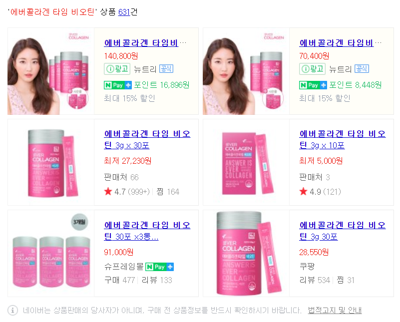 에버콜라겐 타임비오틴은 현재 뉴트리 공식몰에서 10포당 5,000원의 가격이 가장 저렴한 것 같았어요! 하루 한 포 섭취니까 한달 분에 15,000원 정도로 생각하시면 될 것 같습니다.
