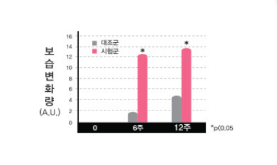 에버콜라겐 타임비오틴에는 저분자콜라겐펩타이드가 1,000mg가 함유되어있어서 식약처로부터 피부 개선 기능성을 인정받은 콜라겐이에요! 아래 자료는 한국인 대상 저분자콜라겐펩타이드 인체시험 결과로 피부 보습, 피부 탄력, 눈가 주름 등의 개선 효과가 나타났습니다.