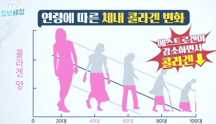 콜라겐은 20대 이후부터 매년 1%씩 감소하여서, 4~50대의 중/장년이 되면 20대의 절반 수준까지 감소하게 됩니다. 하지만 콜라겐은 자체적으로 몸에서 생산되지 않아서 외부 음식이나 건강식품을 통해서 꾸준히 섭취해주는 것이 좋습니다.