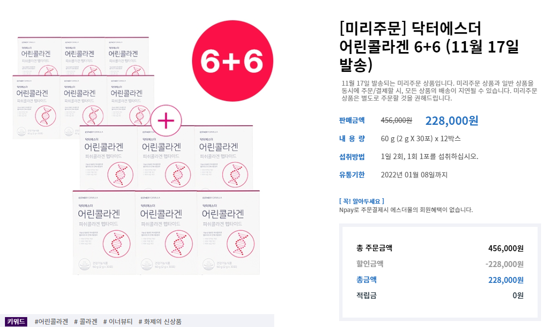 여에스더 어린 콜라겐은 현재 2g x 30포 1박스 기준으로 38,000원 정도의 가격대가 형성되어있는데 에스더몰 공식 홈페이지에서 6+6 이벤트로 228,000원에 판매하고 있었어요!
