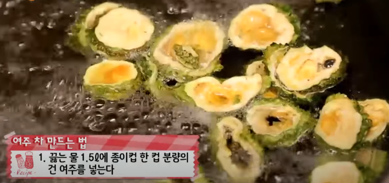 끓는 물 1.5L에 종이컵 한 컵 분량의 여주를 넣으신 다음 물이 절반이 되도록 잘 끓여주시면 쉽게 여주차를