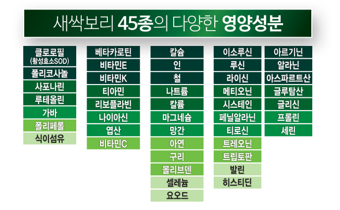유기농 새싹보리 착즙분말의 주요 성분은 사포나린, 폴리코사놀, 클로로필, 베타글루칸이고 또한 새싹보리에는 45종의 다양한 영양성분이 들어있습니다.
