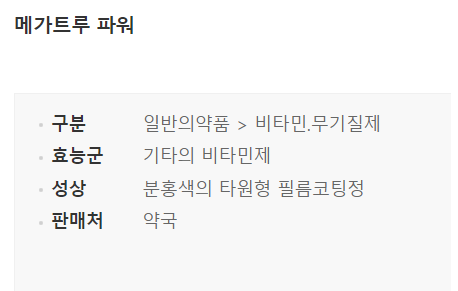 제품의 성분을 자세히 살펴보면 아래와 같은데요, 메가트루 파워는 비타민 B군을 100mg 함유하여 빠른 에너지 생성 및 피로 회복을 기대할 수 있고, 비타민 K, UDCA가 함유되어있어 위장 장애를 개선하고, 고함량 영양제 복용 시 위장장애의 원인이 될 수 있는 비타민 B3, B5를 30mg로 배합하여 위장 장애 개선에 초점을 맞춘 제품입니다.