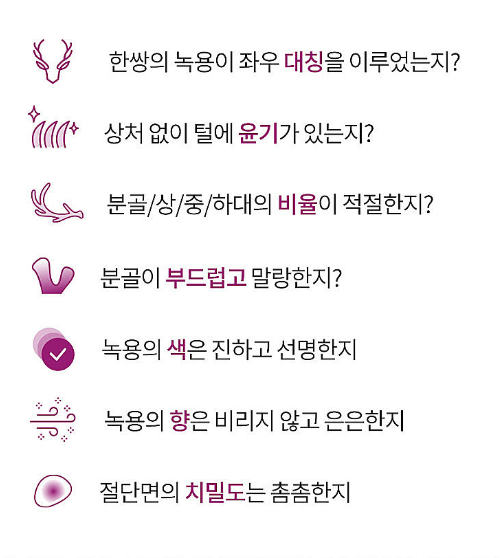 녹용은 칼슘이 매우 풍부합니다. 때문에 성장기 아이들에게 좋고 또한 골다공증, 퇴행성 관절 질환에도 효과적입니다.