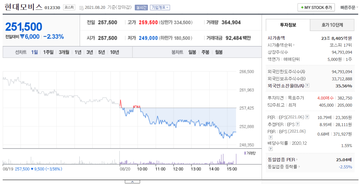 현대모비스는 1997년 6월 설립되었으며, 1989년 9월 5일 한국거래소 유가증권시장에 상장하였습니다. 현대모비스는 환경자동차(하이브리드차(HEV), 플러그인 하이브리드차(PHEV), 전기차(EV), 수소연료전지차(FCEV) 등)용 핵심부품 사업을 영위하고 있습니다. 고무용 도료 기술로 시작하여 폴리우레탄 수지 및 전자, 자동차, 생명과학 등에 사용되는 다양한 정밀화학제품을 생산 및 판매하는 것을 목적사업으로 하고 있습니다. A/S용 부품사업은 부품의 책임공급을 위한 물류센터 등의 인프라 구축과 244개 차종, 270만 품목을 관리하고 있습니다. 2021년 3월 전년 동기 대비 연결기준 매출액 16.5% 증가, 영업이익 35.9% 증가, 당기순이익은 72.1% 증가하였습니다.
