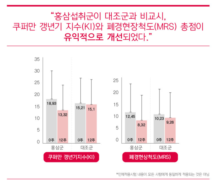 화애락진은 갱년기 여성을 위해 나온 홍삼 제품으로 홍삼을 12주간 복용했을 때 갱년기지수(KI)와 폐경현장척도(MRS)가 유익적으로 개선되었다는 인체적용시험이 있습니다.