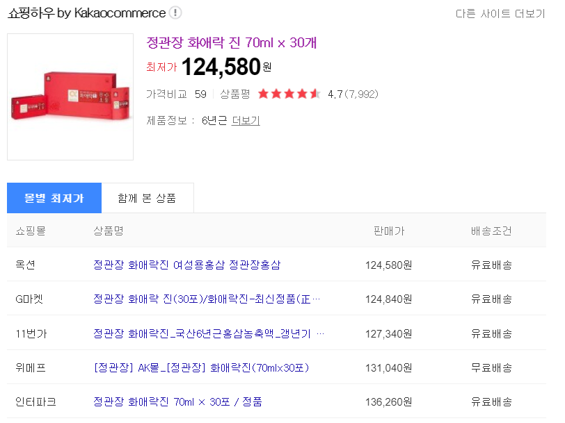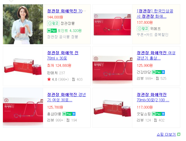 정관장 화애락진은 온라인 상에서 쉽게 구매하실 수 있습니다. 네이버나 다음과 같은 포털사이트에 '정관장 화애락진'을 검색하시면 되는데요 제가 찾아본 정관장 화애락진의 가격은 117,000원 정도가 가장 저렴한 가격이었습니다.
