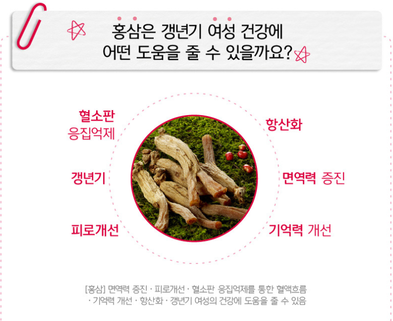 우리에게 홍삼은 일반적으로 면역력 증진, 노화 방지 등의 효능으로 잘 알려져있지만 홍삼은 갱년기에도 매우 좋은 효과가 있습니다.