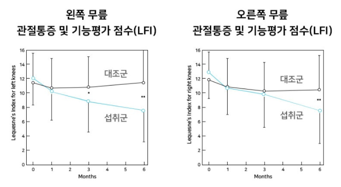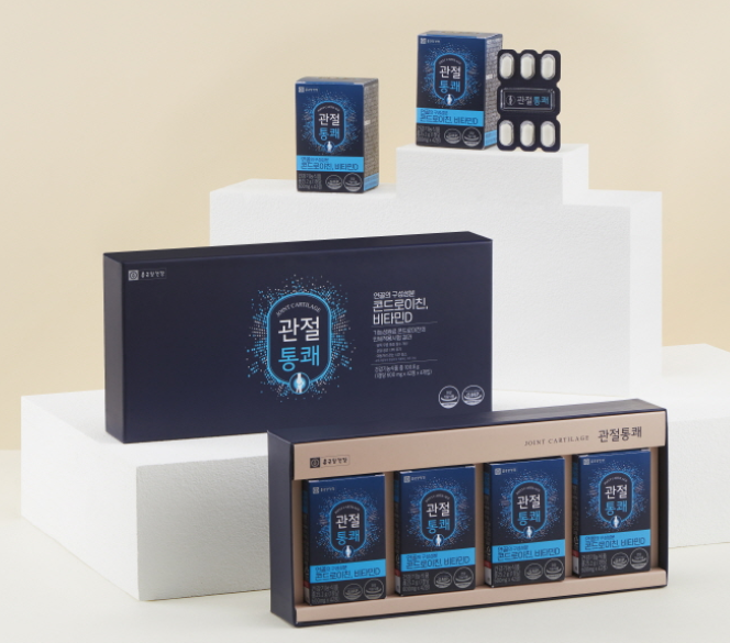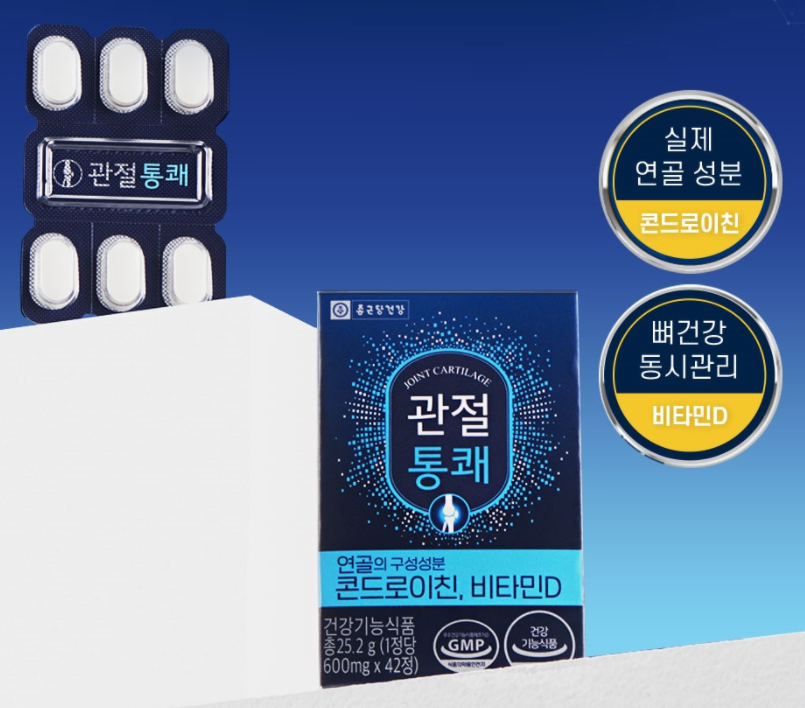 종근당 관절통쾌는 콘드로이친과 비타민 D 성분을 주성분으로 함유하여 단순한 통증 감소에만 도움을 주는 것이 아니라 관절 연골의 구성성분을 채워 뼈 건강뿐 아니라 연골까지 근본적으로 케어할 수 있는 제품입니다. 종근당 관절통쾌에 사용된 기능성 원료 콘드로이친의 실제 인체적용시험을 살펴보면 관절 통증, 양쪽 무릎 관절 통증 및 기능, 보행 시간, 관절 사이 너비, 관절 경직 시간 등의 관절 건강이 개선됨을 확인할 수 있었습니다.