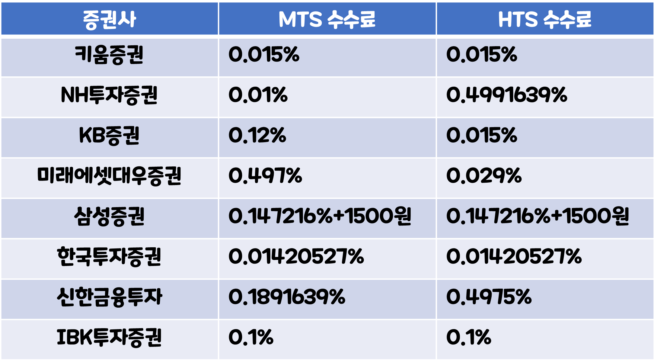 증권사 수수료 비교는 아래 표를 참고하시면 좋은데요, MTS는 모바일 거래 HTS는 PC를 통한 거래입니다.