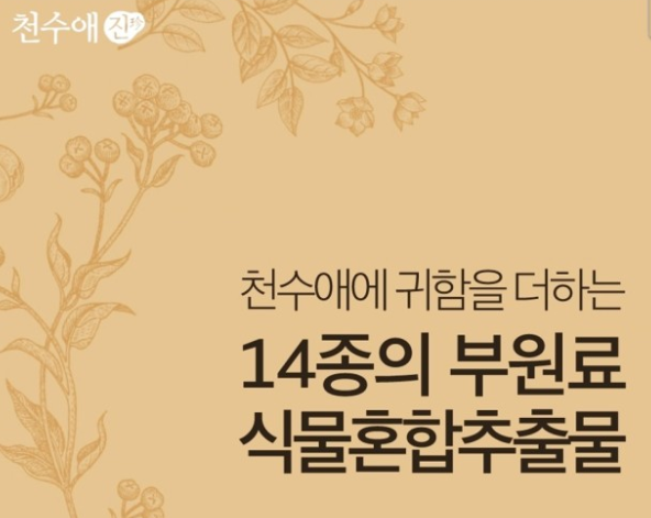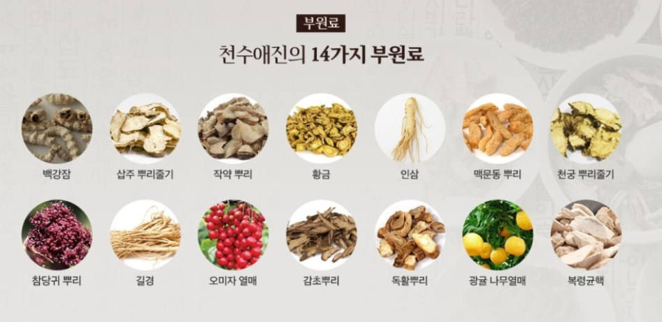추가적으로 천수애진은 수백가지의 전통 원료 중에서 천수애의 엄격한 원료 원칙으로 선정한 14가지의 부원료를 사용했다고 해요!