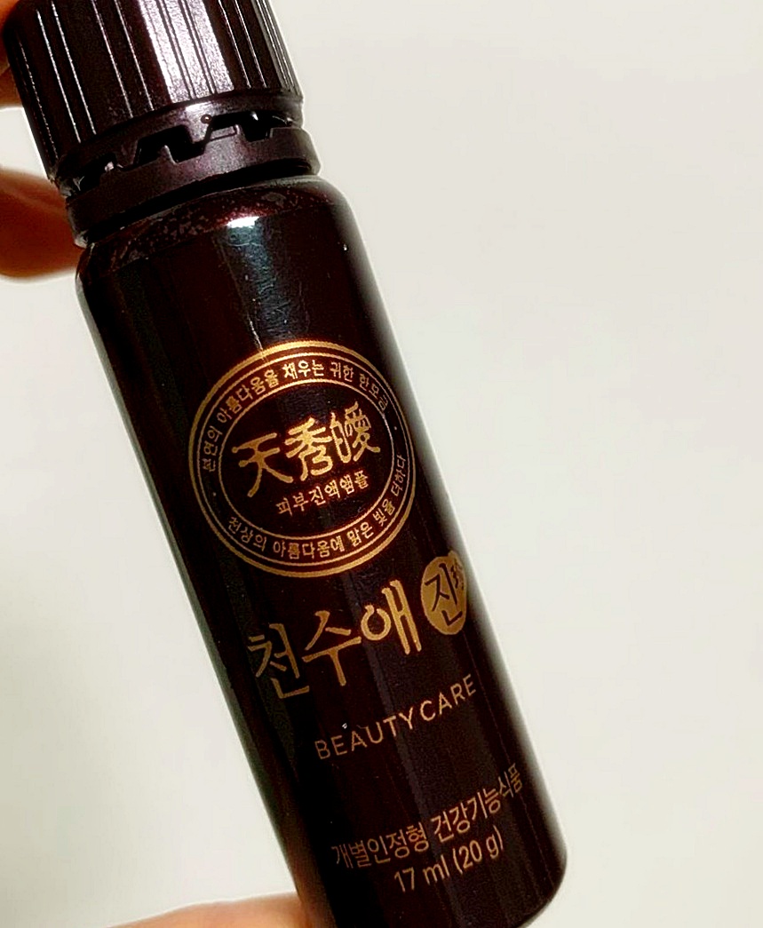 천수애진은 하루에 한 번, 자기 전에 한 병만 섭취해주면 됩니다. 1병에 17ml가 들어있어요. 마시는 콜라겐은 처음이라서 너무 비리면 어떡하나 걱정했는데 먹을만 하더라고요!