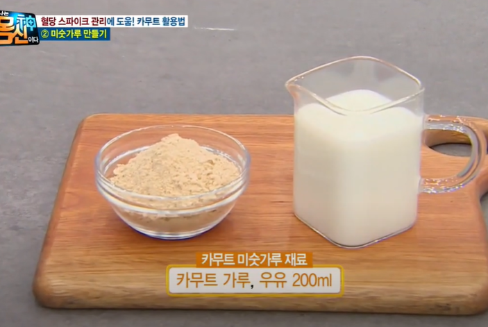 우유 200ml에 카무트를 갈아서 만든 카무트 가루를