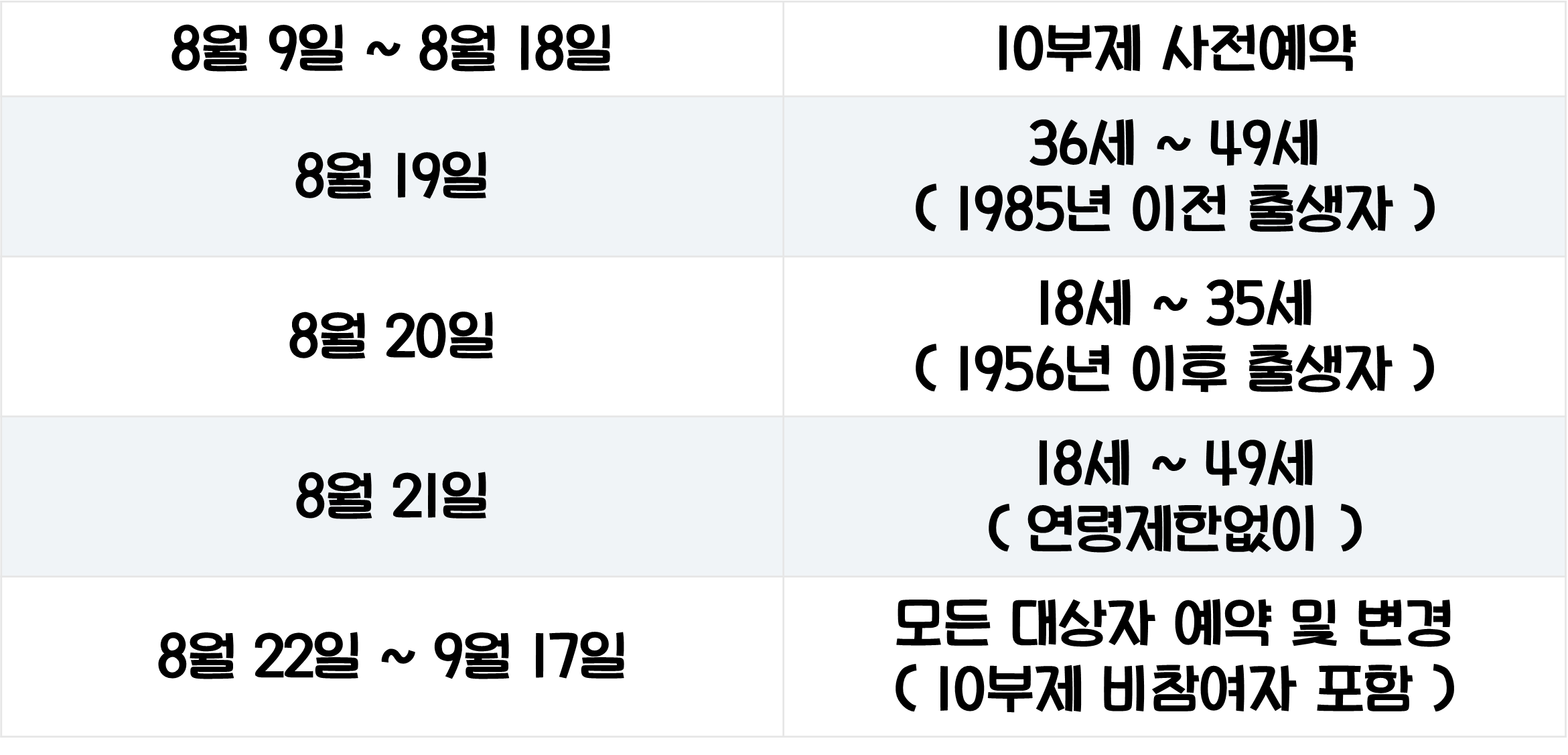 예약 기간은 8월 9일부터 8월 18일까지 가능하며, 시간은 매일 오후 8시부터 다음날 오후 6시에 마감됩니다. 만약 8월 9일부터 8월 18일 사시에 백신 예약을 하지 못했더라면 19~21일 사이에 추가로 예약을 하실 수 있고, 8월 22일부터 9월 17일까지는 모든 예약자 추가 예약과 더불어 기존의 예약을 변경할 수 있습니다. 아래 표에서 일정 참고하시면 좋을 것 같습니다.