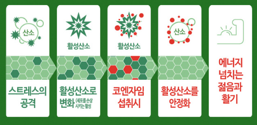 체내에 유해 산소가 쌓이게 되면 건강한 세포가 파괴되어 면역력이 감소하게 됩니다. 때문에 면역력을 강화하기 위해서는 항산화 관리를 해주는 것이 좋습니다. 코엔자임 큐텐이 바로 유해산소로부터 세포를 보호해주고 활성산소를 제거하는 항산화 작용을 하고 있습니다.