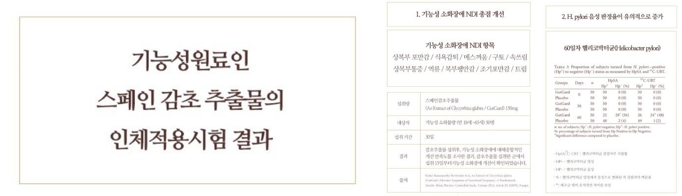 위톱에 함유된 스페인감초추출물은 식약처로부터 이러한 헬리코박터균 증식 억제는 물론 위 점막 보호에 도움이 된다고 인정받은 기능성 원료입니다. 더욱 자세히 알아보면 전 세계적으로 약 20여종이 있는 감초는 오래전부터 널리 사용되어왔는데요, 감초 추출물에 함유된 글라브리딘(Glabridin)이라는 성분은 유용한 천연 소화제로, 위의 운동 기능 증진 및 소화 효소 투입 등의 효능과 더불어 헬리코박터균의 활동을 억제하는데 도움이 된다고 합니다.