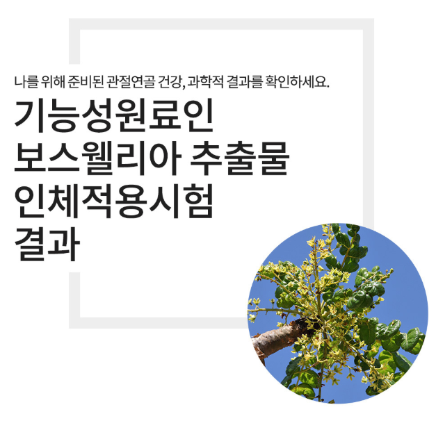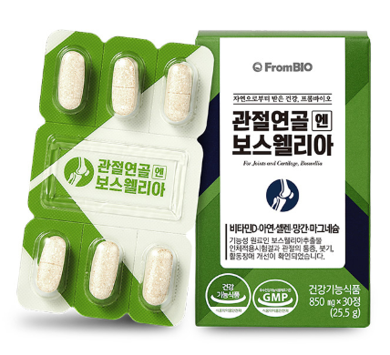 프롬바이오 보스웰리아는 식약처에서 관절건강 기능성, 안정성을 인정받은 제품이고 100% 식물성 원료 보스웰리아 추출물을 사용하여 인체적용시험을 끝낸 제품이기 때문에 안심하고 섭취할 수 있습니다.