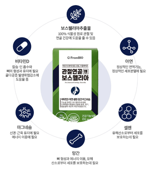 프롬바이오 관절연골엔 보스웰리아의 주요 성분은 보스웰리아추출물, 비타민 D, 아연, 마그네슘, 셀렌, 망간입니다.