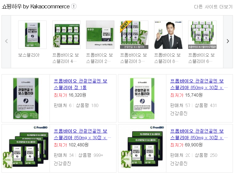 보스웰리아는 인터넷 상에서 쉽게 구매하실 수 있습니다. 네이버나 다음과 같은 포털사이트에 프롬바이오 보스웰리아를 검색하시면 되는데요 제가 검색해본 바로는 30정 한 통의 최저가가 약 15,000원 정도였어요!