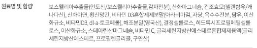 보스웰리아의 핵심 성분 보스웰릭산은 체내의 염증 유발 물질의 생성을 억제하고 연골 기능의 유지를 도와서 관절을 튼튼하게 유지하는 데 도움을 줍니다. 뿐만 아니라 제품에 함유된 추가 5종의 기능성 성분으로 뼈 건강과 요즘 많은 분들이 관심을 가지시는 면역력, 그리고 항산화 건강까지 모두 챙길 수 있는 제품이에요.