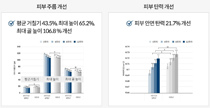 HY7114 유산균은 국내 최다 5중 기능성 유산균으로 장 건강은 물론 근본적인 피부 건강까지 챙길 수 있는 유산균으로 실제로 12주간 HY7114 유산균을 성인 여성에게 섭취하게 하였더니 피부 주름, 피부 탄력, 피부 수분 등이 유의적으로 개선되는 것을 확인할 수 있었어요.