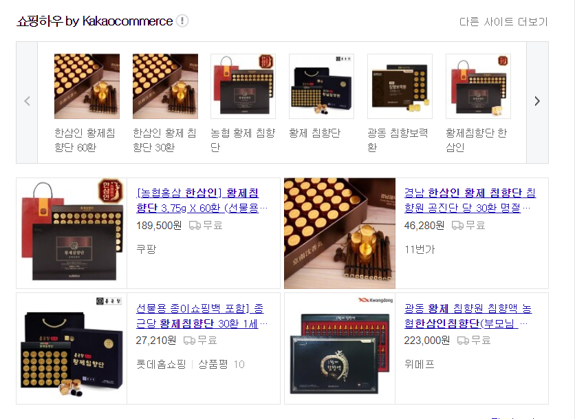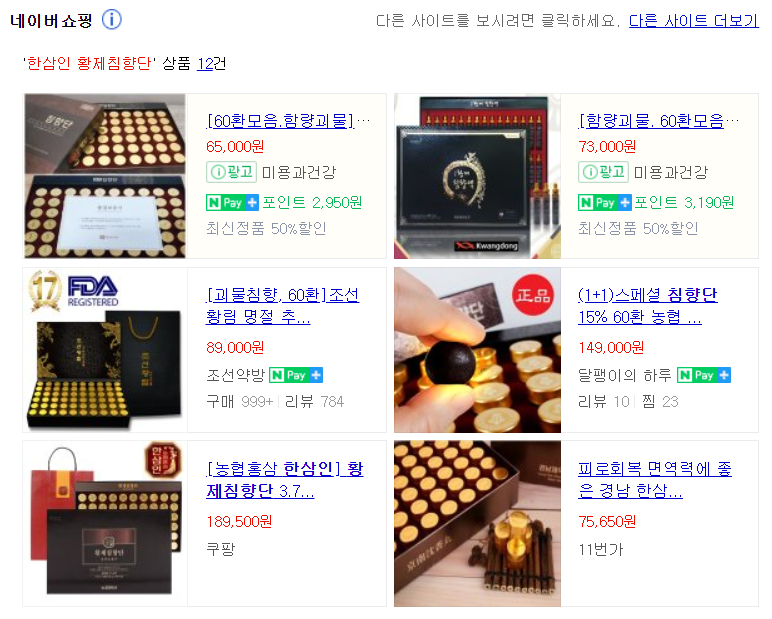 한삼인 황제침향단은 온라인 상에서 쉽게 구매하실 수 있는데요 네이버나 다음과 같은 포털사이트에 '한삼인 황제침향단' 을 검색하시면 됩니다. 그런데 주의하실 점은 위 사진과 같이 한삼인 황제침향단을 검색했음에도 다른 제품이 나오는 경우도 많고 다른 제품과 외관도 비슷해서 들어가서 다른 제품인 것을 알게 된 경우도 많았어요. 들어가서 제품명을 다시 한번 확인해보시기 바랍니다.