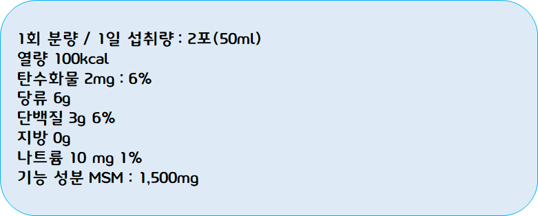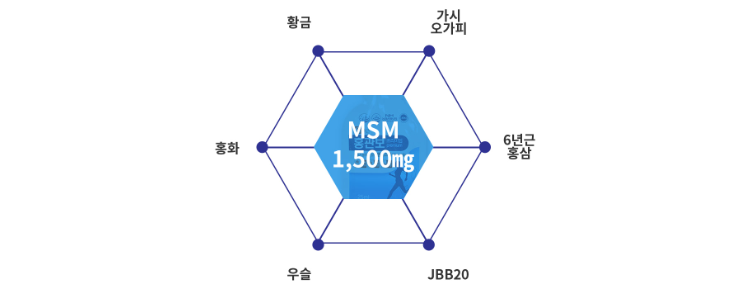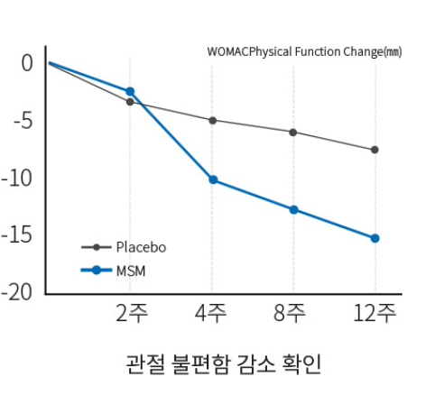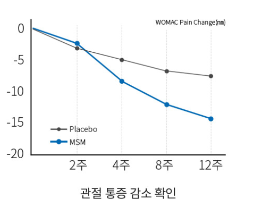 이 MSM 은 관절관련 건강식품에는 빠지지 않고 들어가는 성분으로 식약처에서도 관절과 연골건강에 도움을 줄 수 있다고 인정을 받은 성분이에요. 무릎 관절이 불편한 40~76세의 성인 남녀 50명을 대상으로 12주간 MSM 성분을 섭취하게 하였더니 관절의 통증과 불편함이 확연히 개선되는 것을 확인할 수 있었습니다. 또한 MSM은 면역력 강화에도 도움이 될 수 있고 피부와 머리카락의 구성성분인 콜라겐과 케라틴을 생성하는데에도 관여하기 때문에 피부와 머리카락에도 도움을 줄 수 있는 성분입니다.