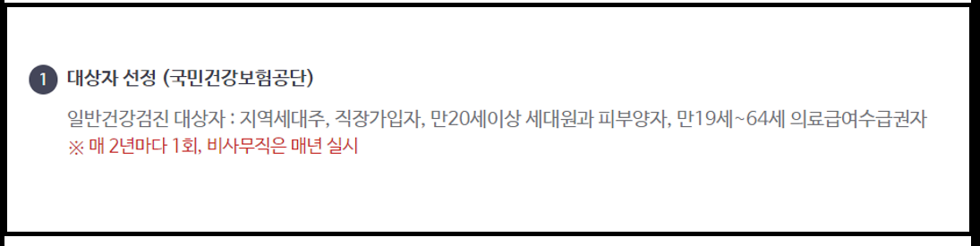 일반 건강검진 대상자는 지역 세대주와 만 20세 이상의 세대원과 피부양자 그리고 직장 가입자, 만 19세~64세의 의료급여 수급권자가 대상입니다. 나라의 정책에 따라 2년마다 한 번씩 건강검진을 의무적으로 받게 되어있고 비사무직은 매년 실시하도록 되어있습니다.