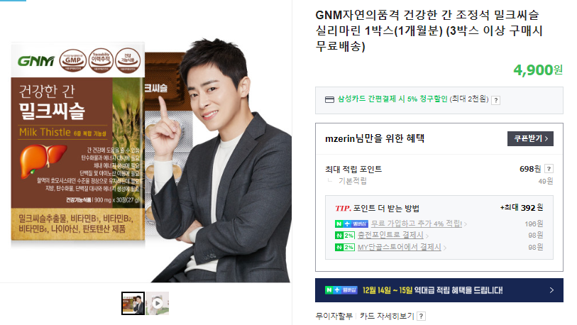gnm 밀크씨슬은 현재 gnm 자연의 품격 공식 홈페이지에서 1박스(1개월분) 기준으로 4,900원에 판매하고 있었습니다.