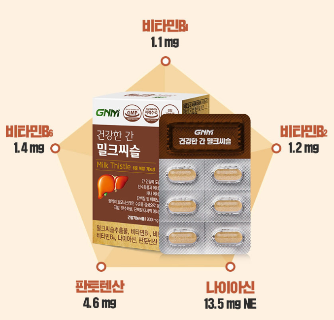 gnm 밀크씨슬의 또 한가지의 특징은 밀크씨슬 천연 추출물 뿐만 아니라 비타민 B와 미네랄 5종을 첨가한 복합 기능성 제품이라는 것이에요! 체내 세포대사에서 중요한 역할을 수행하는 비타민 B군은 매일 보충해 주는 것이 좋은데요, 하루 1정으로 간 건강과 함께 체내 에너지 생성, 단백질 대사 등에도 도움을 줄 수 있습니다.
