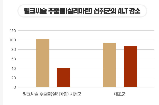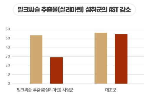 gnm 밀크씨슬의 원료로 사용된 밀크씨슬 추출물의 인체적용시험결과 약 8주간 밀크씨슬 추출물을 섭취하게 하였더니 간 기능의 주요지표 ALT와 AST가 모두 감소하여 간 건강에 도움을 주는 것을 확인할 수 있었어요.