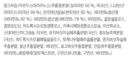 gnm 밀크씨슬의 부원료로는 홍삼 농축액 분말, 운지버섯 자실체 추출 분말, 영지버섯 자실체 추출 분말, 헛개나무 열매추출물 분말, 울금 추출물 분말, 표고버섯 추출물 분말, 민들레 추출물 분말 등이 함께 사용되었다고 합니다.