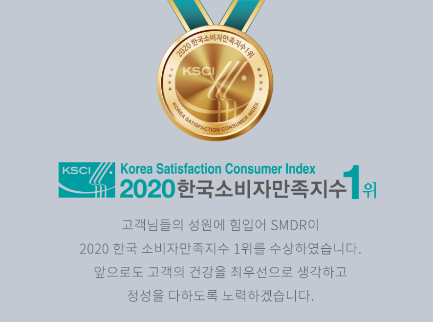 SMDR은 건강기능식품(수면 영양제)부문 2020 한국소비자만족지수 1위를 수상한 제품으로 많은 분들의 사랑을 받고 있는 제품입니다.