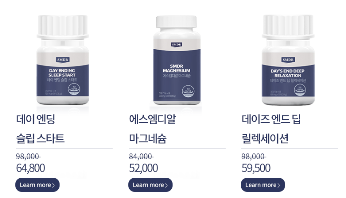 smdr 수면영양제의 가격은 현재 공식홈페이지에서 데이 엔딩 슬립 스타트 제품은 64,800원, 에스엠디알 마그네슘 제품은 52,000원, 데이즈 엔드 딥 릴렉세이션 제품은 59,500원의 가격으로 판매되고 있습니다.