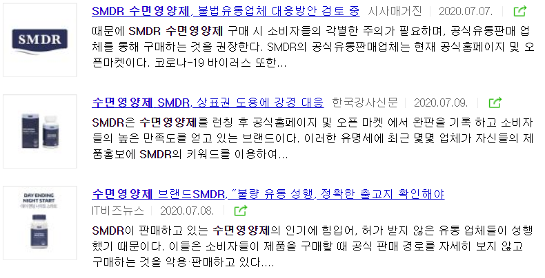 최근 SMDR 상표권 도용, 불량 유통 등이 성행하고 있다고 합니다. SMDR은 현재 공식홈페이지 또는 대형 소셜 커머스 업체에서만 판매 중이라고 하니 구매하실 때 SMDR 정품 제품인지 꼭 확인하시고 구매해야 하셔야 할 것 같습니다!