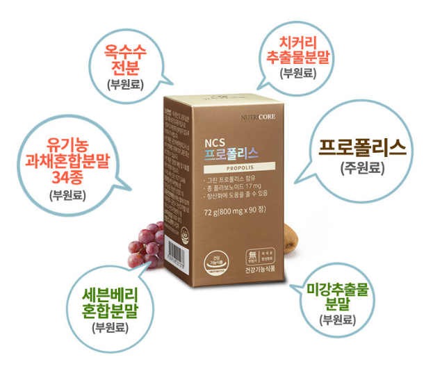 NCS란 제조 과정에서 화학부형제를 사용하지 않은 제품을 말합니다. 알약을 제조할 때 생산성을 높이기 위하여 사용되는 화학성분이 바로 화학부형제인데요 화학부형제는 소량이라도 체내에 쌓이게 되면 부작용의 우려가 매우 크다고 합니다. 뉴트리코어 NCS 프로폴리스는 화학부형제를 사용하지 않았다고 하니 안심하고 먹을 수 있는 것 같습니다!