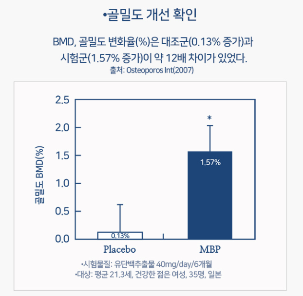 MBP의 인체적용시험 결과를 살펴보면 골밀도의 증가, 개선 그리고 뼈형성 지표의 유의적 증가되었고, 뼈 파괴 지표인 DPD와 NTx는 감소된 것을 확인할 수 있었어요.