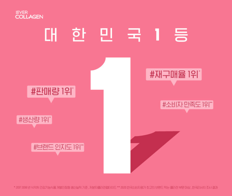 에버콜라겐 타임은 뉴트리에서 나온 콜라겐으로 판매량, 생산량, 브랜드 인지도, 재구매율, 소비자 만족도 모두 1위를 달성한 제품이에요. 저는 제품을 구매할 때 재구매율을 눈 여겨 보는편인데요, 그 이유는 한번 구매한 사람이 재구매를 했다는 것은 어느정도 효과가 검증된 제품이라고 생각을 하기 때문이에요!