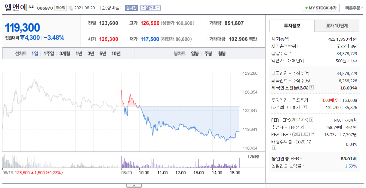 엘앤에프는 2000년 7월에 설립되어 2차 전지 양극 활물질과 방열 테이프 및 전극용 paset를 생산 판매하고 있으며 전기차 배터리 관련주입니다. 2016년 2월 2차 전지 시장의 성장과 글로벌 사업 경쟁력을 강화하기 위하여 자회사 엘앤에프 신소재와 흡수 합병하였고, 엘앤에프의 종속회사로는 2차전지용 양극 활물질을 생산하는 무석광 미래 신재료 유한공사와 정보, 전자, 화학 관련 소재를 제조 및 판매하는 제이에이치 화학공업(주)이 있습니다. 2021년 1분기 실적은 전년 동기 대비 매출액 41.6% 증가하였고, 영업손실은 33억 원, 단기순손실 36억 원을 기록하면서 적자 전환하였습니다. 매출은 크게 증가하였으나 전기차 향 양극재 공장 증설에 따른 감가상각비 반명 및 제조 부문 대규모 인력 채용 등에 따라 손실을 기록하였습니다.
