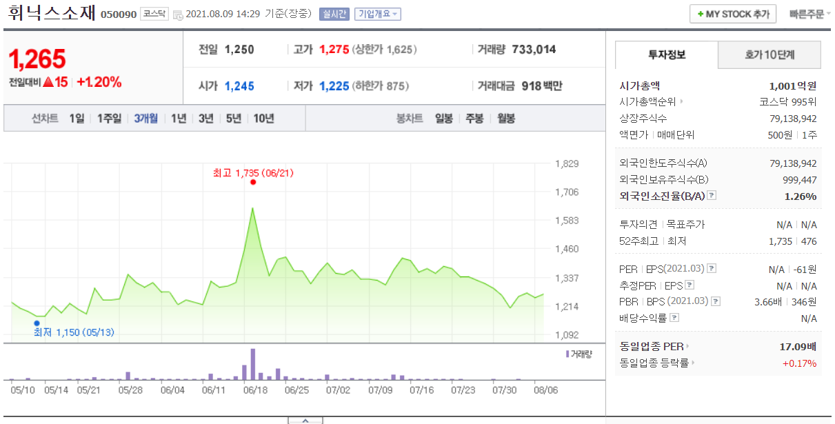 휘닉스소재는 2000년 6월 설립되었으며 2004년 6월 코스닥시장에 상장하였습니다. 휘닉스소재는 고부가가치 소재사업인 Metal Paste 사업, 반도체 패키징용 솔더볼사업 등을 영위하고 있으며 지속적으로 시장점유율 및 영업력을 확장해나가고 있습니다. 현재 비대면 경제 산업이 가속화되면서 서버, PC, 노트북 등 IT 디바이스와 5G 등 통신 부문 투자가 늘었으며, 코로나19 충격으로 상반기에 주춤했던 모바일 수요도 하반기에는 회복세에 접어들었습니다. 휘닉스 소재는 대표와 최재형 감사원장이 경기고 및 서울대학교 동문이라는 사실이 부각되며 최재형 관련주로 편입되었습니다.